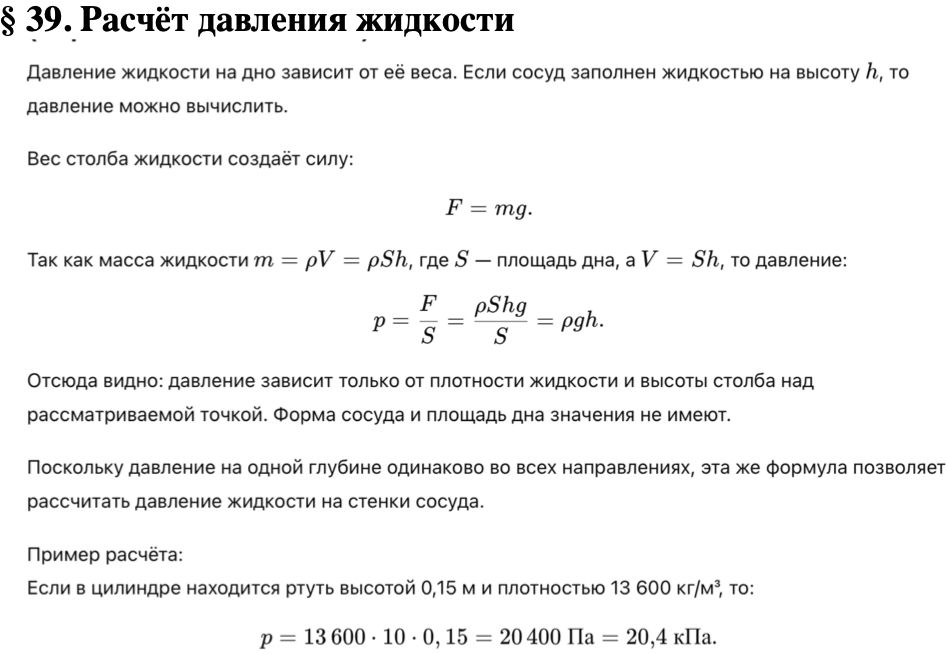Краткое содержание параграф 39 учебник по физике Перышкин, Иванов 7 класс Навигация по записям ← Предыдущий ответСледующий ответ → § 39. Расчёт давления жидкости Навигация по записям ← Предыдущий ответСледующий ответ → Перейти к выбору задания
