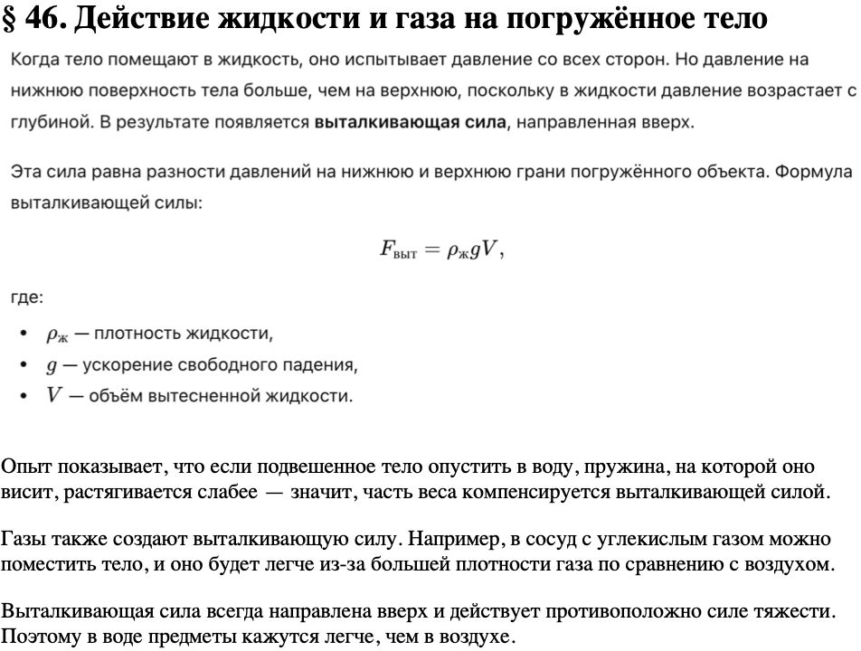 Краткое содержание параграф 46 учебник по физике Перышкин, Иванов 7 класс Навигация по записям ← Предыдущий ответСледующий ответ → § 46. Действие жидкости и газа на погружённое тело Навигация по записям ← Предыдущий ответСледующий ответ → Перейти к выбору задания