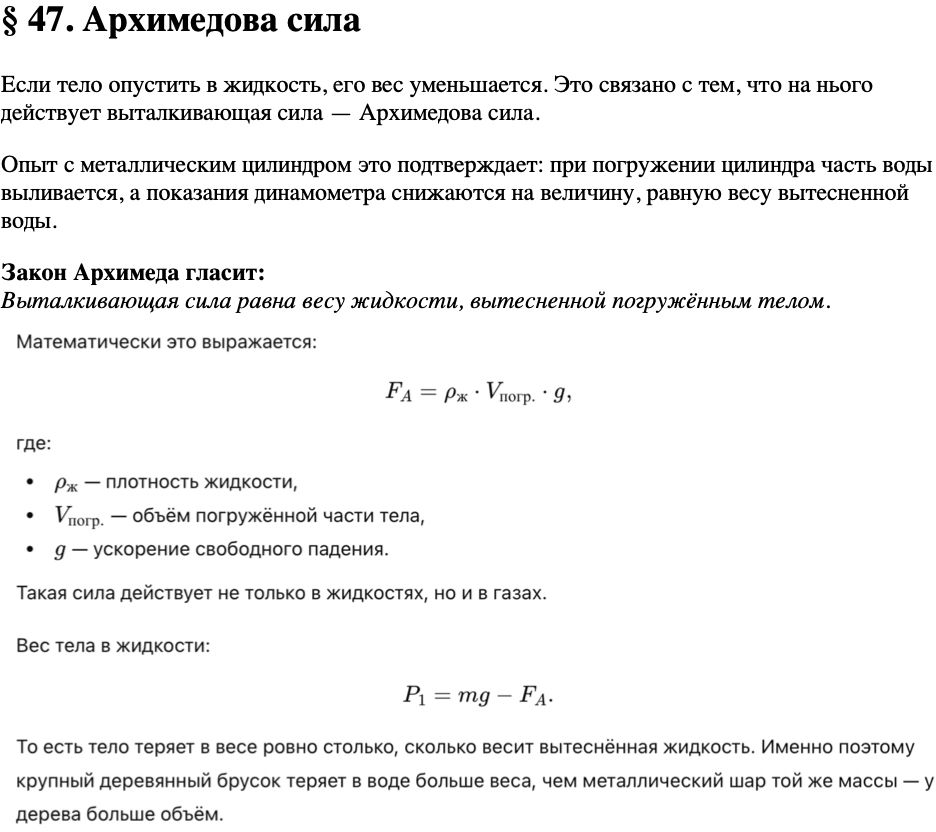 Краткое содержание параграф 47 учебник по физике Перышкин, Иванов 7 класс Навигация по записям ← Предыдущий ответСледующий ответ → § 47. Архимедова сила Навигация по записям ← Предыдущий ответСледующий ответ → Перейти к выбору задания