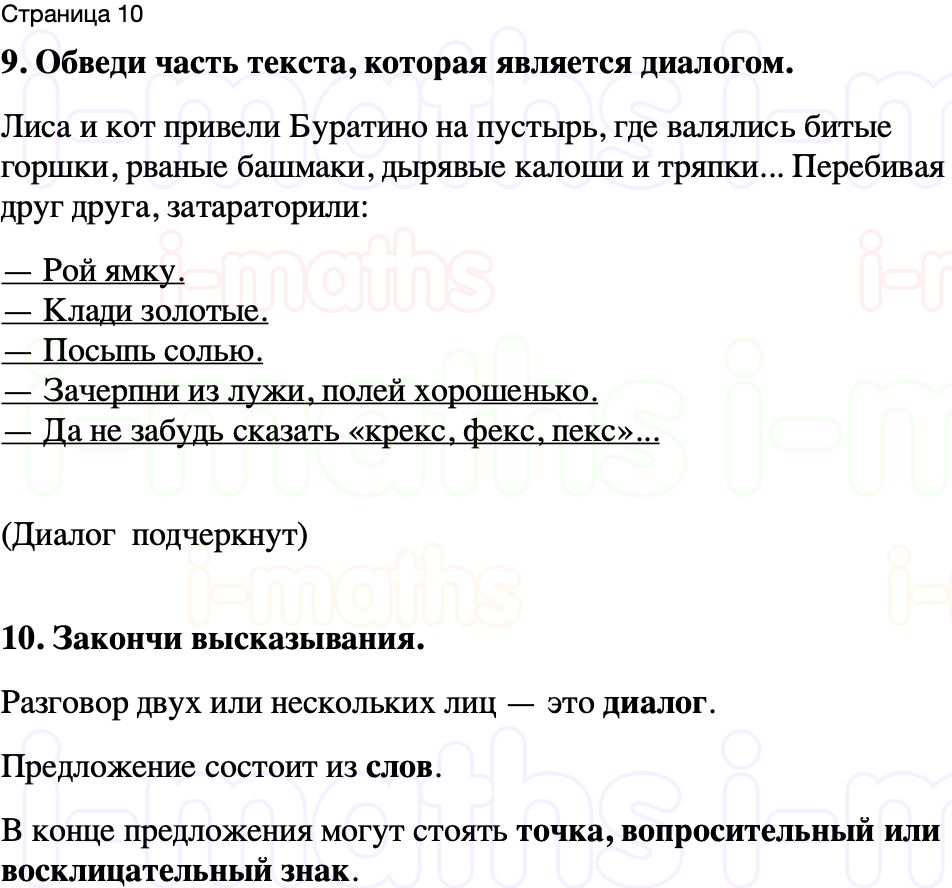 Страница 10 тренажер по русскому языку Канакина, Горецкий 1 класс Навигация по записям ← Предыдущий ответСледующий ответ → 9. Обведи часть текста, которая является диалогом. 10. Закончи высказывания. Навигация по записям ← Предыдущий ответСледующий ответ → Перейти к выбору задания