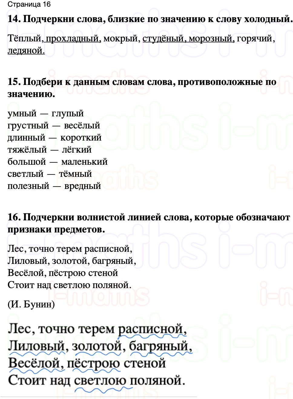 16. Подчеркни волнистой линией слова, которые обозначают признаки предметов.