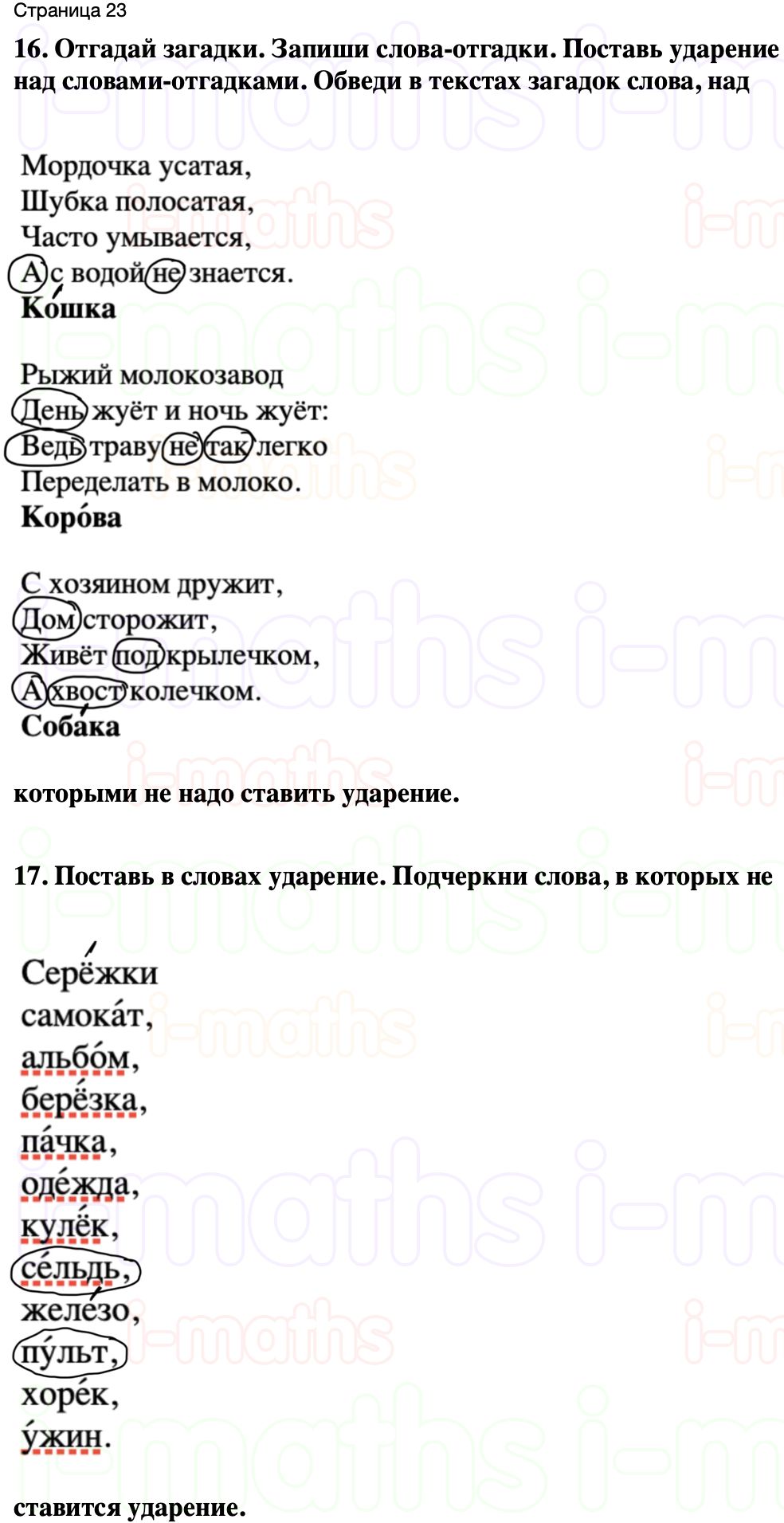 16. Отгадай загадки. Запиши слова-отгадки. Поставь ударение над словами-отгадками. Обведи в текстах загадок слова, над которыми не надо ставить ударение.