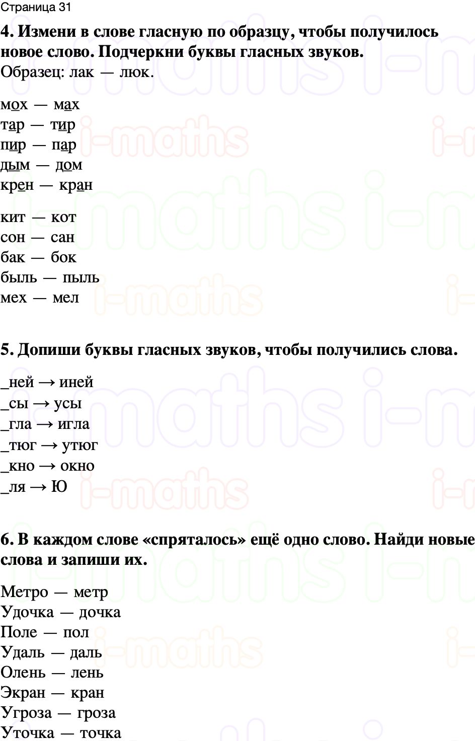 4. Измени в слове гласную по образцу, чтобы получилось новое слово. Подчеркни буквы гласных звуков.
