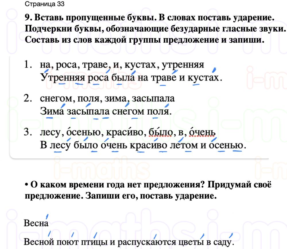 9. Вставь пропущенные буквы. В словах поставь ударение. Подчеркни буквы, обозначающие безударные гласные звуки. Составь из слов каждой группы предложение и запиши.