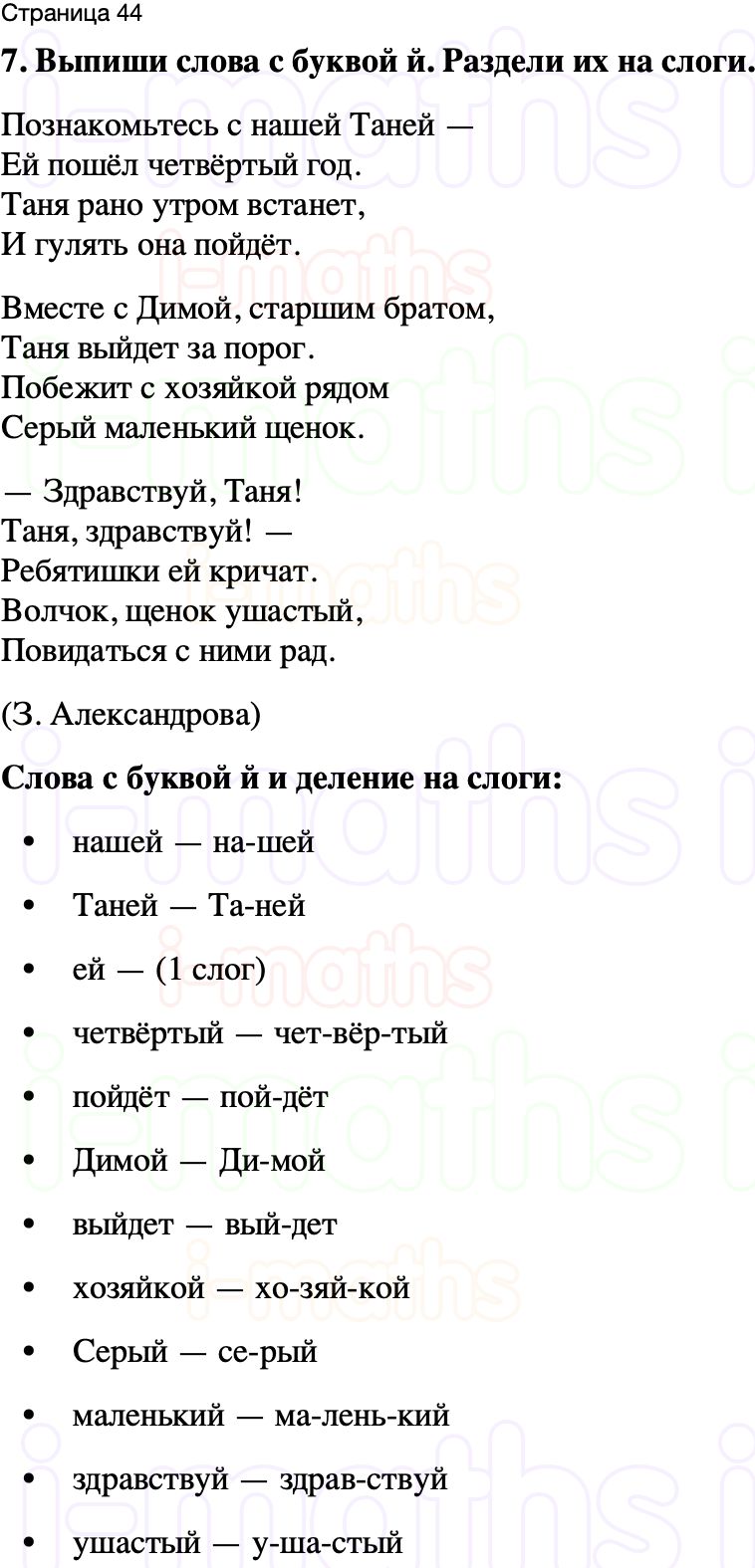 Страница 44 тренажер по русскому языку Канакина, Горецкий 1 класс Навигация по записям ← Предыдущий ответСледующий ответ → 7. Выпиши слова с буквой й. Раздели их на слоги. Навигация по записям ← Предыдущий ответСледующий ответ → Перейти к выбору задания