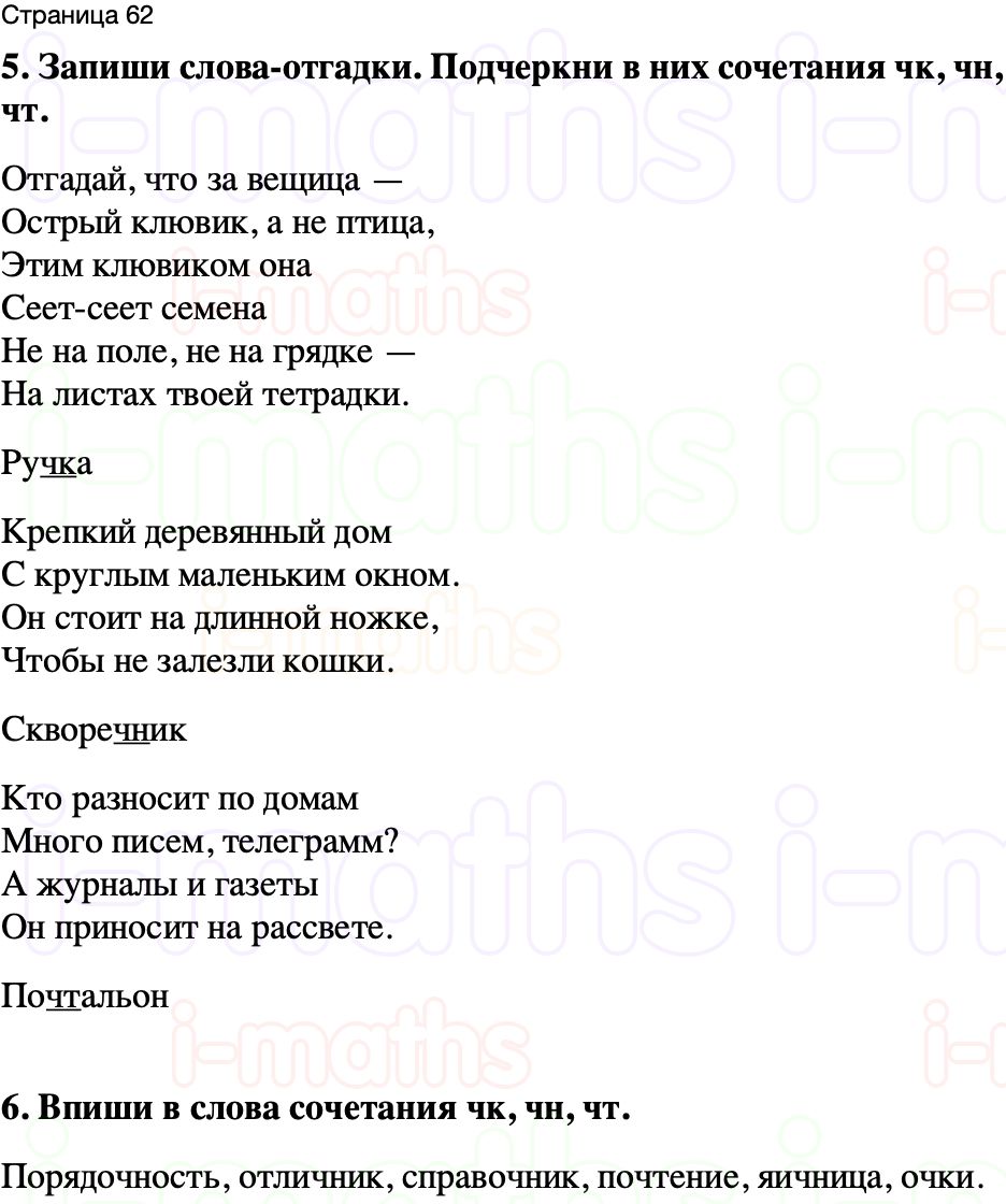 Страница 62 тренажер по русскому языку Канакина, Горецкий 1 класс Навигация по записям ← Предыдущий ответСледующий ответ → 5. Запиши слова-отгадки. Подчеркни в них сочетания чк, чн, чт. 6. Впиши в слова сочетания чк, чн, чт. Навигация по записям ← Предыдущий ответСледующий ответ → Перейти к выбору задания