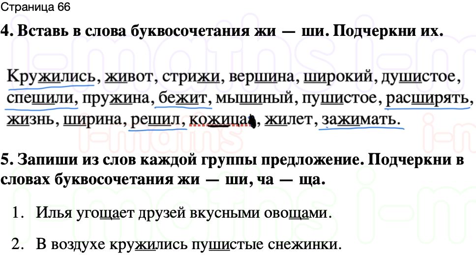 4. Вставь в слова буквосочетания жи — ши. Подчеркни их.