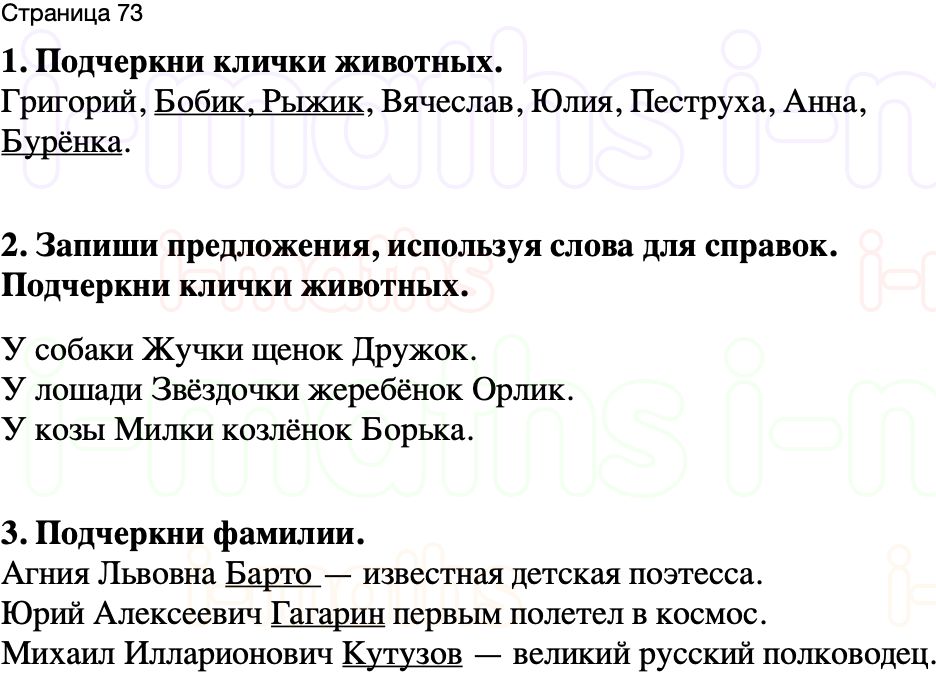 2. Запиши предложения, используя слова для справок. Подчеркни клички животных.